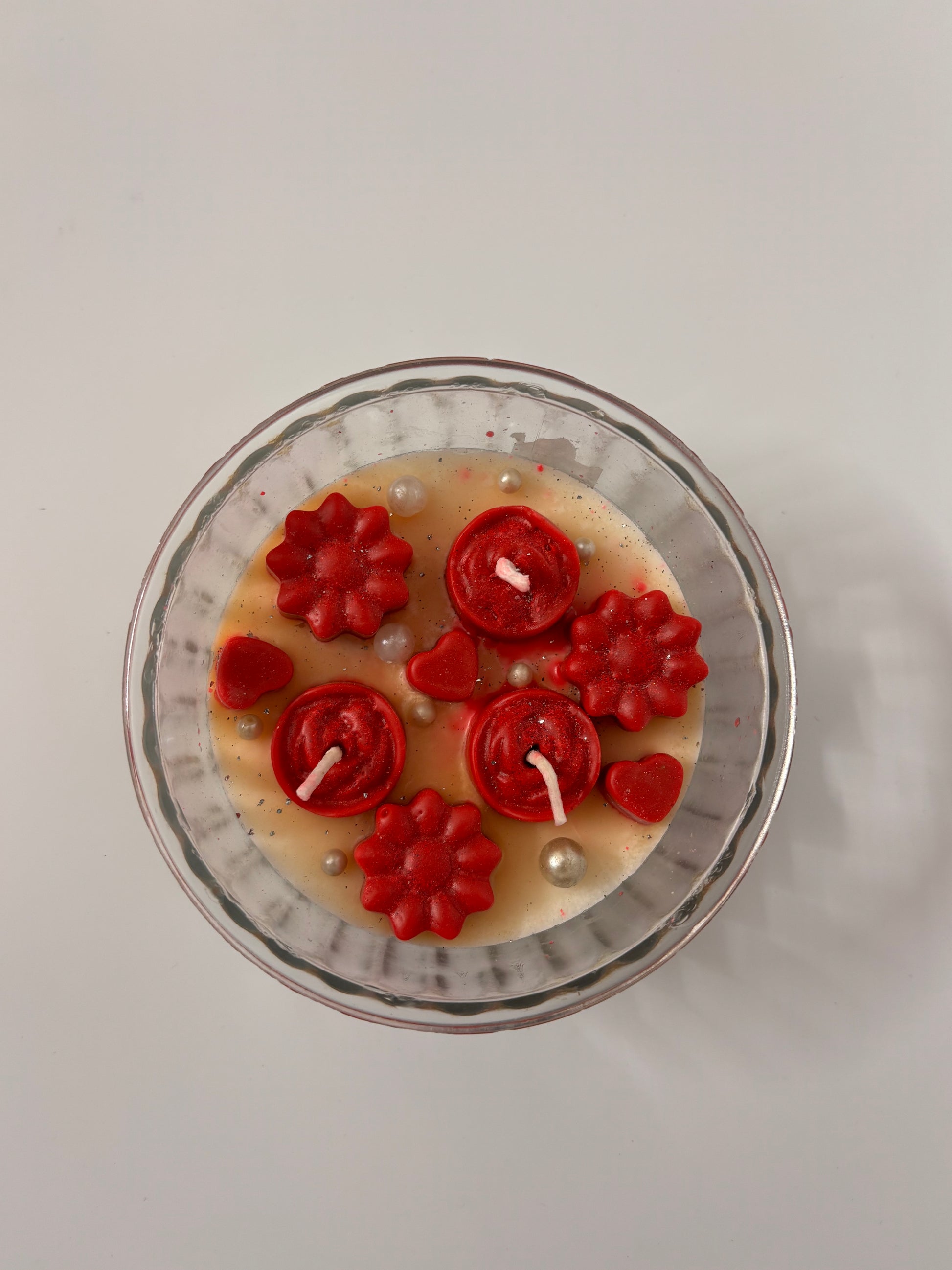 A beautifully crafted decorative candle bowl featuring vibrant red flower and heart-shaped floating candles set in a clear glass dish. Accented with pearl-like beads, this piece creates a warm, romantic glow—perfect for festive décor, home styling, centerpieces, or gifting.